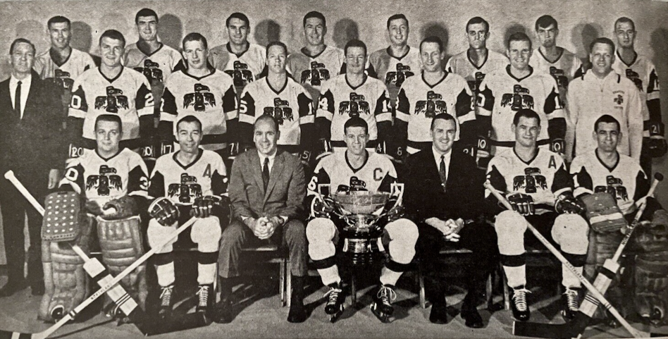 Front Row L to R - Jim Armstrong, Guyle Fielder, Bill MacFarland (coach-general manager), Gerry Leonard (captain), Murray Costello (executive director), Don Ward, Jim McLeod.