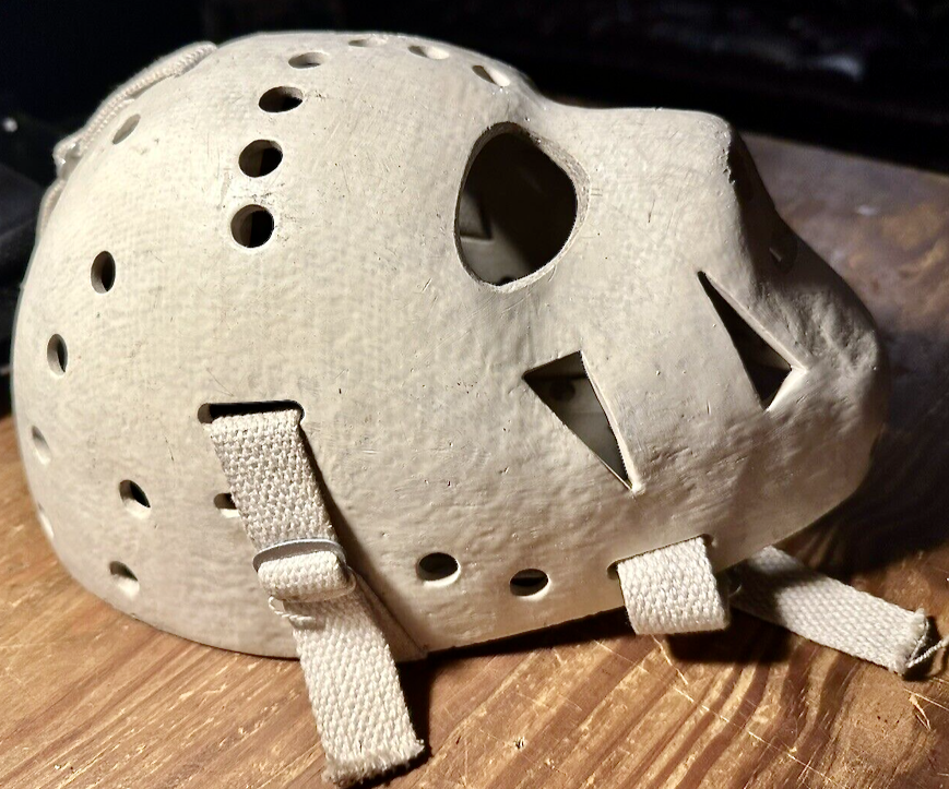 Vintage goalie mask was made out of rigid fiberglass and still has the inside foam paddings and original straps.