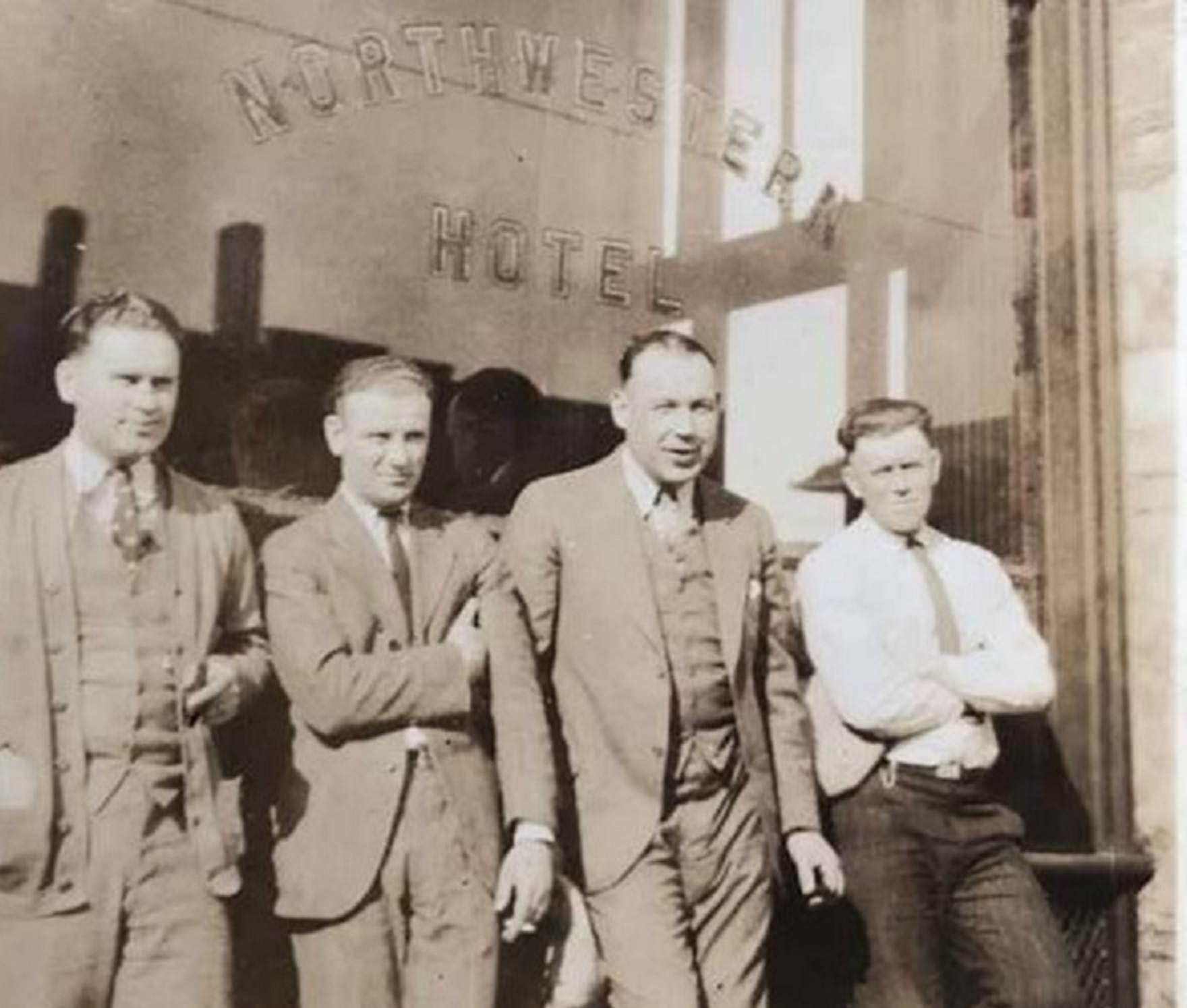 Taffy Abel - Age 26 August 12, 1926 - 3rd from left in front of Northwestern Hotel in Sault Ste Marie, Michigan - Taffy was on his way to New York City to sign on August 14, 1926 with the New York Rangers and then he went to the NYR training camp in Toronto October 20. His best friend, Sam, is at far left. Howard Marley is 2nd from left. Taffy made history on November 16, 1926 with the NYR when he became the first Native American / Indigenous pro hockey player in the NHL. He broke the NHL BIPOC Color Barrier that day. New York Rangers granted a NHL franchise May 15, 1926.