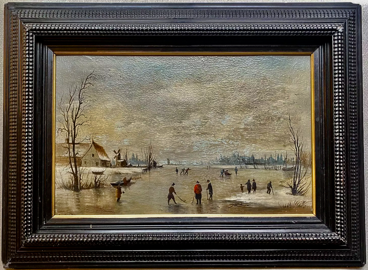 Small antique Dutch Painting featuring the game of Kolf / Kolven being played on a frozen river or canal