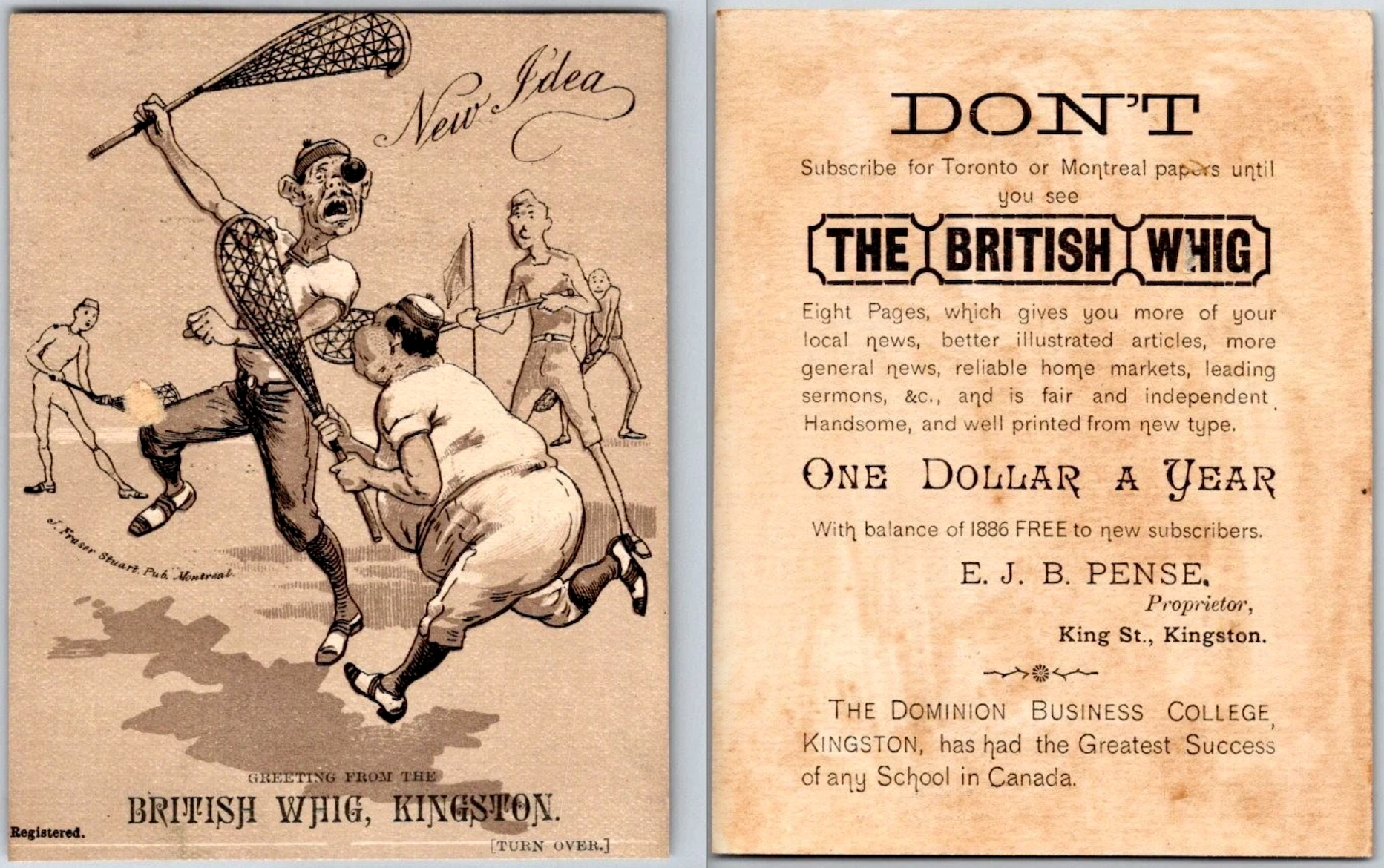 Front side has caricature Lacrosse players, with the ball about to hit one of them in the face, while the backside has a promotion for The British Whig (Daily British Whig), as it was a newspaper based in Kingston, Ontario.