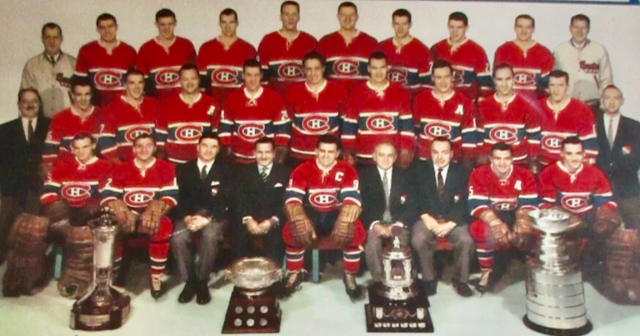 Front Row L to R - Charlie Hodge, Dickie Moore, Ken Reardon (vice president), Hartland de M. Molson (president/owner), Maurice "Rocket" Richard, Frank J. Selke Sr. (manager), Toe Blake (coach), Bernie Geoffrion, Jacques Plante.