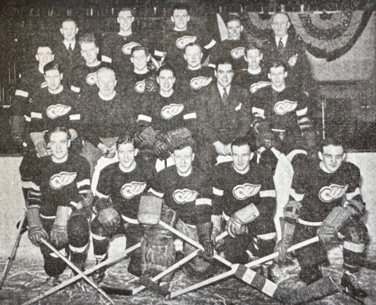 2nd Row - Marty Barry, Jack Adams (coach & gm), Doug Young, James D. Norris Jr (co-owner), Syd Howe.