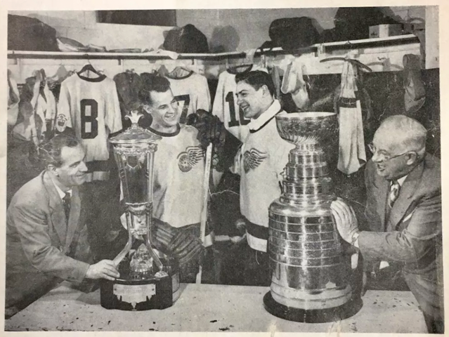 The Detroit News staged the photo after the Red Wings clinched their 3rd straight Prince of Wales Trophy as NHL regular season champions and were defending Stanley Cup champs.