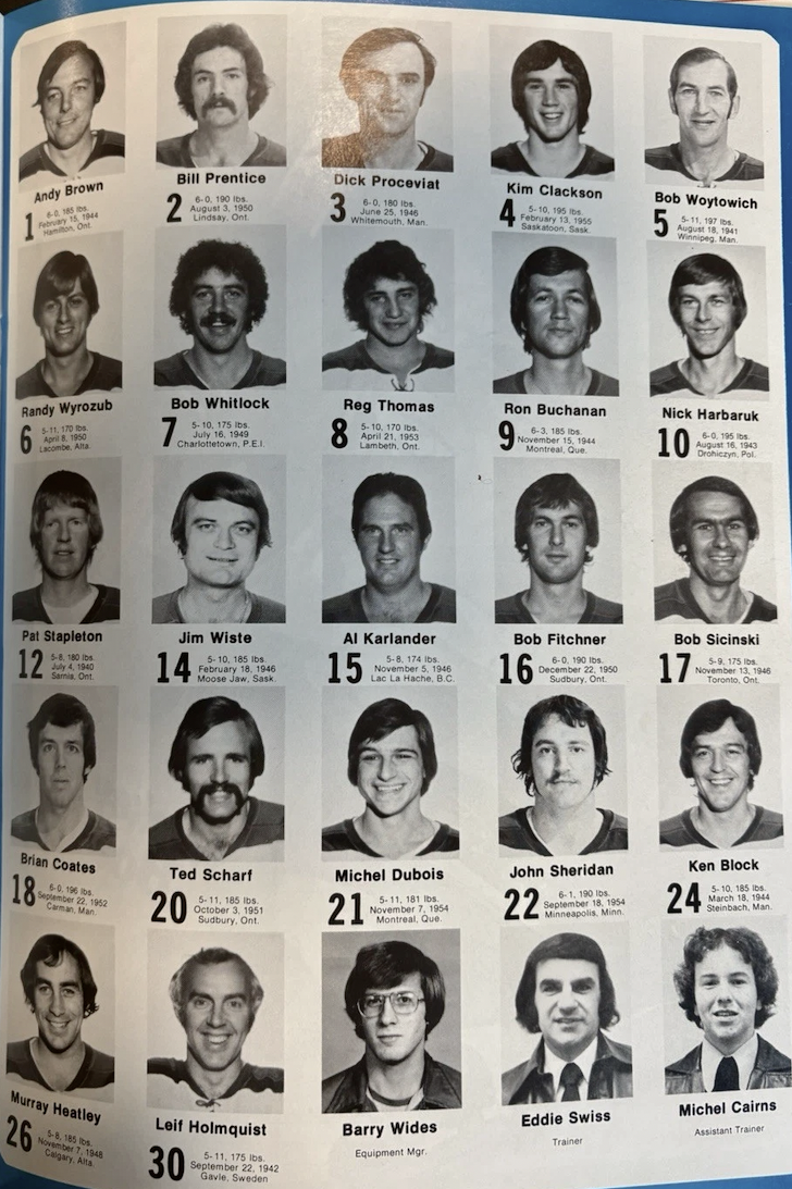 Bottom Row - Murray Heatley, Leif Holmquist (goalie), Barry Wides (equipment), Eddie Swiss (trainer), Michel Cairns (assistant trainer).
