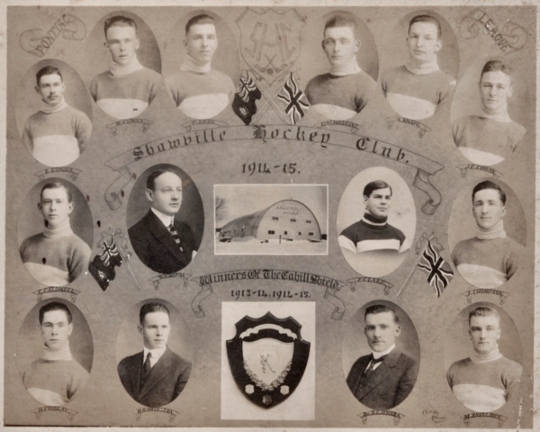 Top Row L to R - L. Ethier, W. Cowan, C. Shaw (goalie), Cyrus Hodgins, A. Shaw, J.E. Cowan.