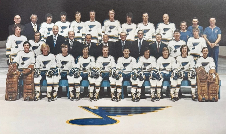 Middle Row - Kevin O'Shea, Bob Plager, Jim Cullen (legal council), Lynn Patrick (vice president), Sid Salomon III (executive vice president), Sidney Salomon Jr. (president), Sid Abel (general manager), Al Arbour (coach), Bill McCreary (assistant to executive vice president), Noel Picard, Curt Bennett.