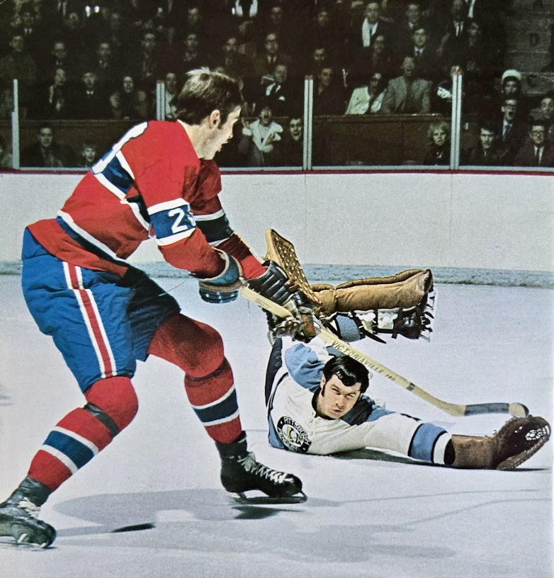 Montreal Canadiens Pete Mahovlich try's to score on Pittsburgh Penguins Al Smith 1970