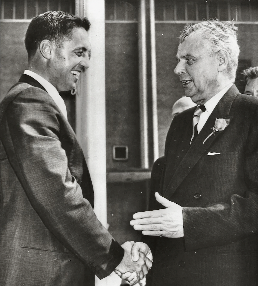 Montreal Canadiens Jean Béliveau shakes the hand of Canadian Prime Minister John Diefenbaker at the opening of Canada's Hockey Hall of Fame in the Canadian National Exhibition / CNE on August 26, 1961.