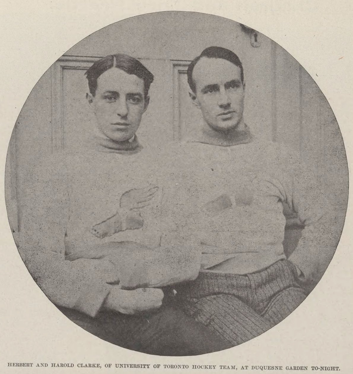 EditKingston, Ontario native brothers Herbert Secord "Herb" Clarke (1887–1938), and Harold Metcalfe "Hal" Clarke (1885–1924), wearing sweaters of the Kingston Beechgrove Frontenacs junior OHA (Ontario Hockey Association) team.