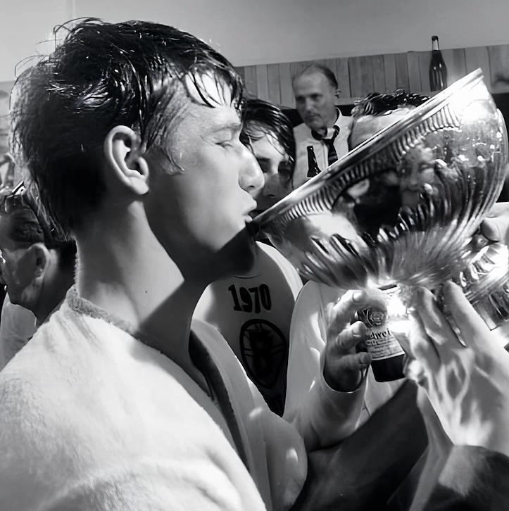 Boston Bruins overtime hero Bobby Orr, drinks from the Stanley Cup Bowl in the Bruins dressing room at Boston Garden.