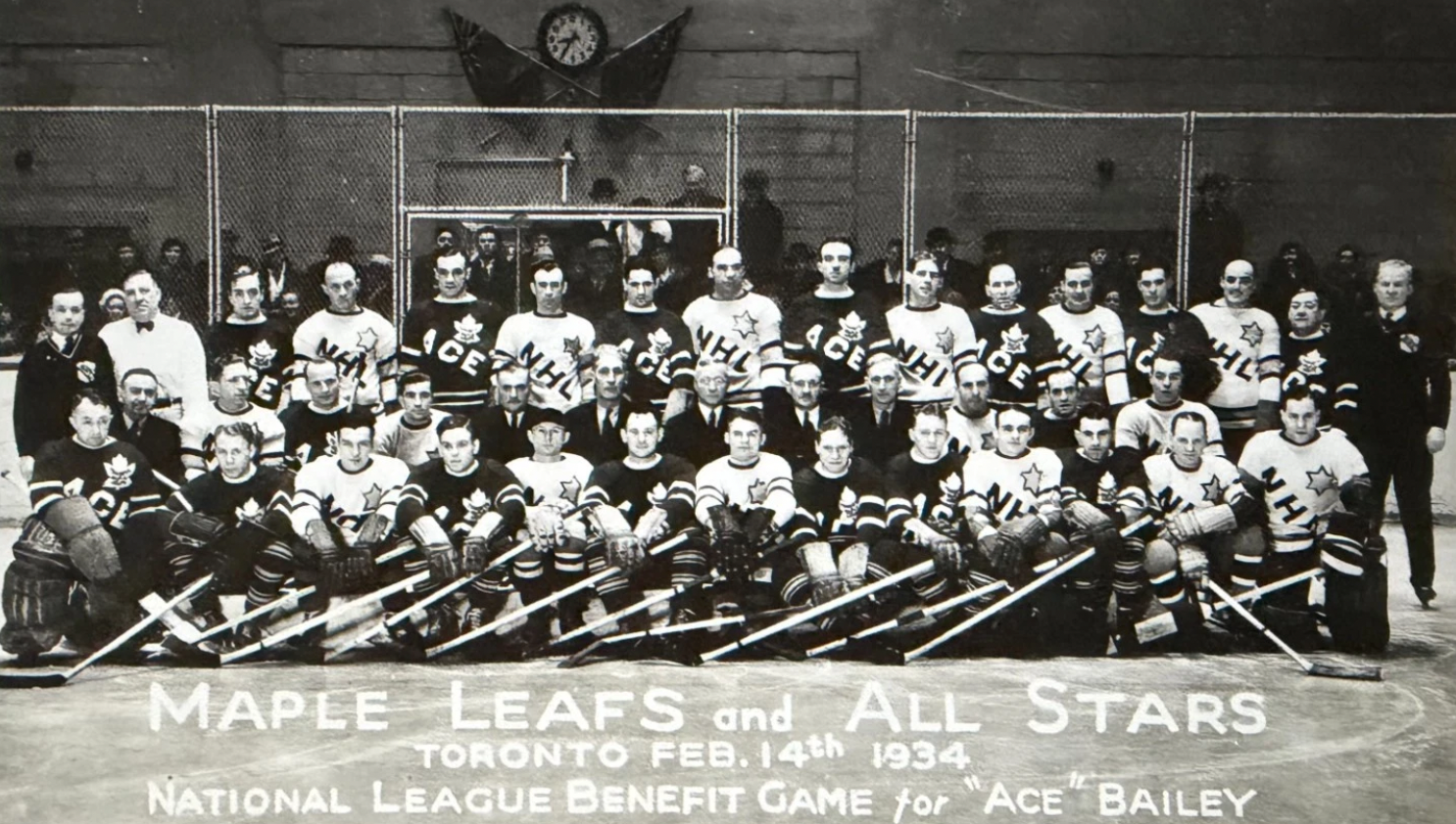 NHL All-Stars in white jerseys - Charlie Gardiner (Chicago Black Hawks), Eddie Shore (Boston Bruins), Frank Finnigan (Ottawa Senators), Aurèle Joliat (Montreal Canadiens), Herbie Lewis (Detroit Red Wings), Ching Johnson (New York Rangers), Lionel Conacher (Chicago Black Hawks), Nels Stewart (Boston Bruins), Hooley Smith (Montreal Maroons), Norman Himes (New York Americans), Red Dutton (New York Americans), Larry Aurie (Detroit Red Wings), Bill Cook (New York Rangers), Howie Morenz (Montreal Canadiens), Al Shields (Ottawa Senators), Jimmy Ward (Montreal Maroons).