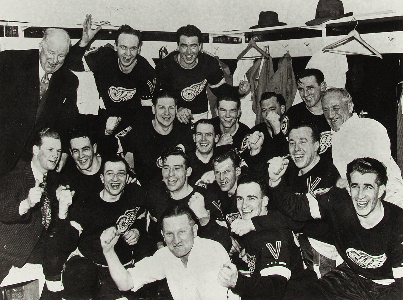 Don Grosso, Carl Liscombe, Connie Brown, Syd Howe, Mud Bruneteau, Eddie Wares, John "Cully" Simon, Jimmy Orlando, John "Black Jack" Stewart, Sid Abel, Alex Motter, Harry Watson, Joe Carveth, Harold Jackson, Johnny Mowers (goalie), Ralph "Red" Almas, (practice goalie).