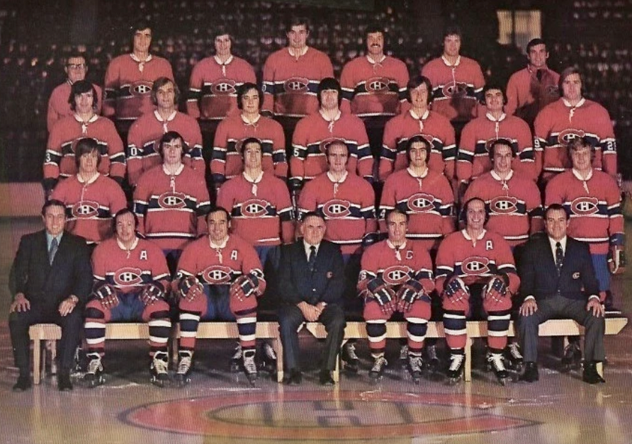 Front Row L to R - Jean Béliveau (vice president), Yvan Cournoyer, Frank Mahovlich, Sam Pollock (general manager), Henri Richard, Jacques Laperrière, Scotty Bowman (coach).