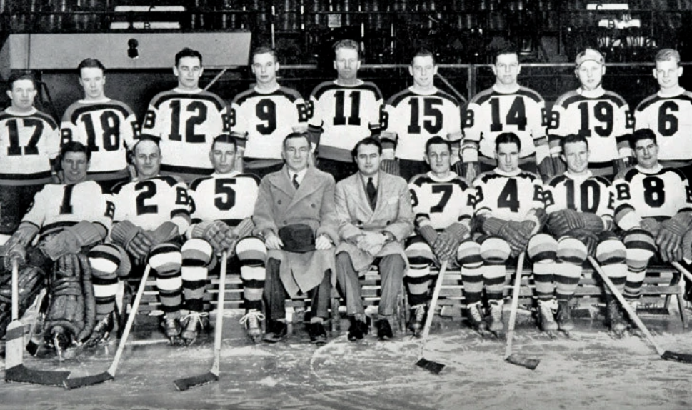 Front Row L to R - Frank Brimsek, Eddie Shore, Dit Clapper, Art Ross (manager), Weston Adams (president), Cooney Weiland (player coach), Charlie Sands, Bill Cowley, Jack Portland.