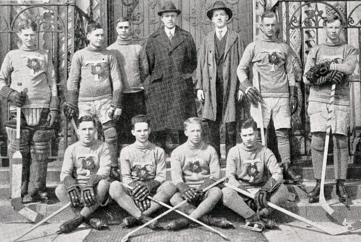 Top Row - Wylie Wilkinson (goalie), John Wilson, Harry Westerby (trainer), Dr. Roy Thomas (coach), R. West (manager), Russell Sandercock, James Mathers.