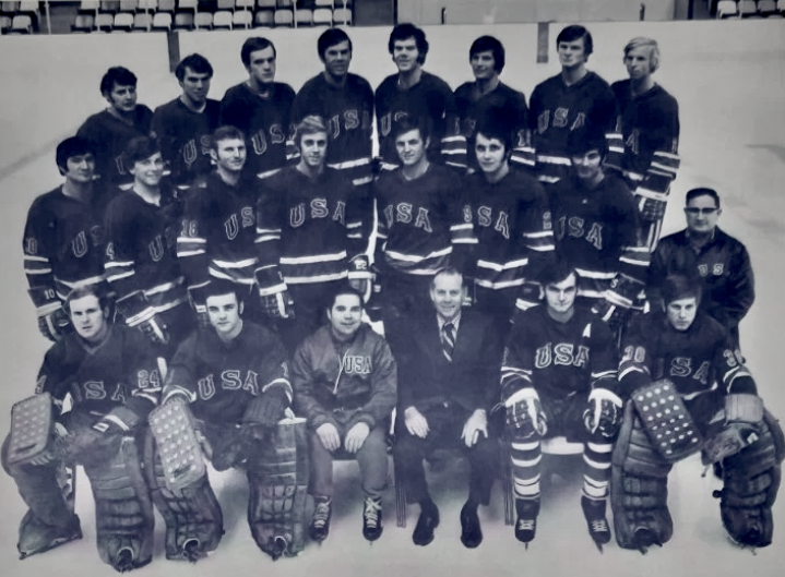 Middle Row - Henry Boucha, Tom Mellor, Ron Naslund, Bruce LaHue, Frank Sanders, Larry Bader, Tim Sheehy, Bud Kessel (trainer).