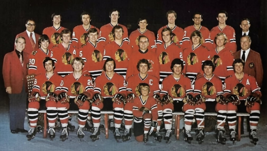 Front Row L to R - J.P. Bordeleau, Dan Maloney, Larry Romanchych, Jean-Paul LeBlanc (captain), Dan Spring, Dave Hudson, Bill Young. - Mike Askew (mascot).