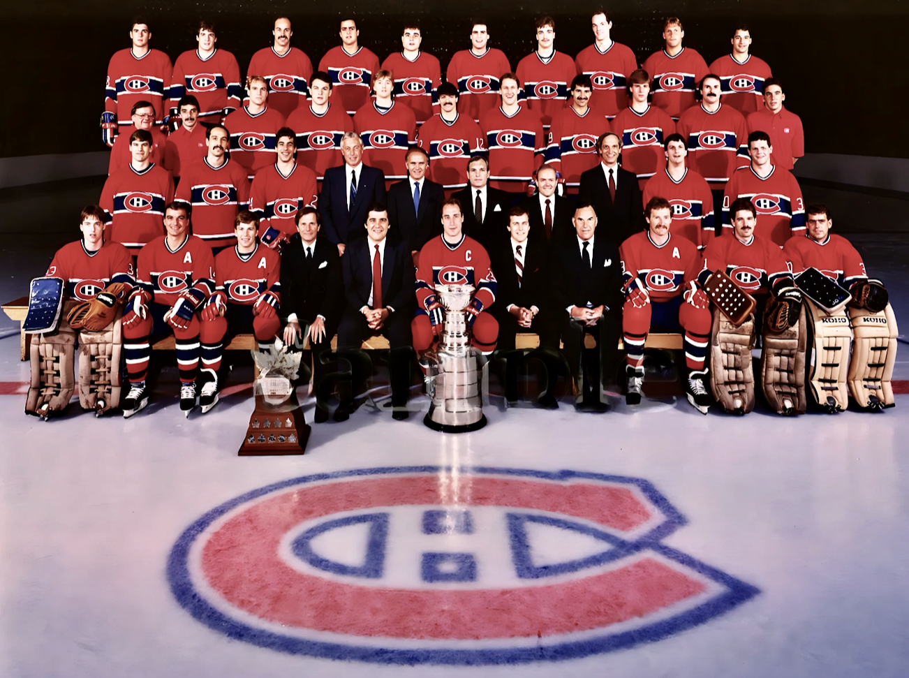 Front Row L to R - Patrick Roy, Mario Tremblay (A), Mats Näslund (A), Ronald Corey (president), Serge Savard (general manager), Bob Gainey (captain), Jean Parron (coach), Morgan McCammon, Larry Robinson (A), Doug Soetaert, Steve Penney.